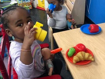 The toddler environment provides a safe secure learning space for exploration and curiosity. The classroom consists of a home, block, art, book, manipulative, music, science and sensory area.