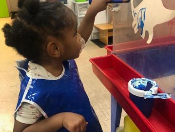 The art area invites the children to express their emotions through creativity. While the children are utilizing the different tools to create they are developing fine motor skills and hand-eye coordination. By providing open ended questions it allows the child to use their cognitive and problem solving skills to think of a subject, design and create. The art area encourages understanding of spatial relations, perspective, dimensions, critical thinking, and self- expression.